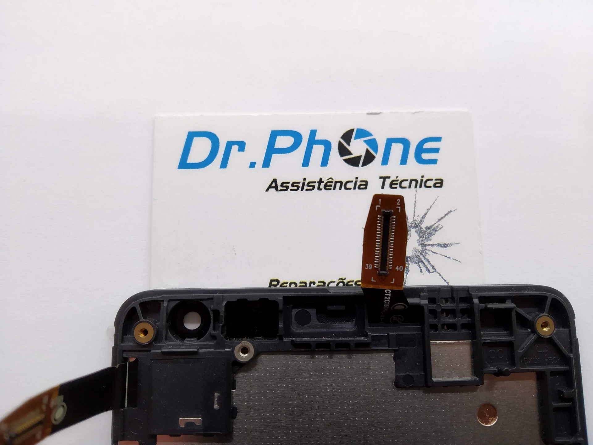 Componente frontal de smartphone com flex cables sobre papel com texto Dr.Phone Assistência Técnica