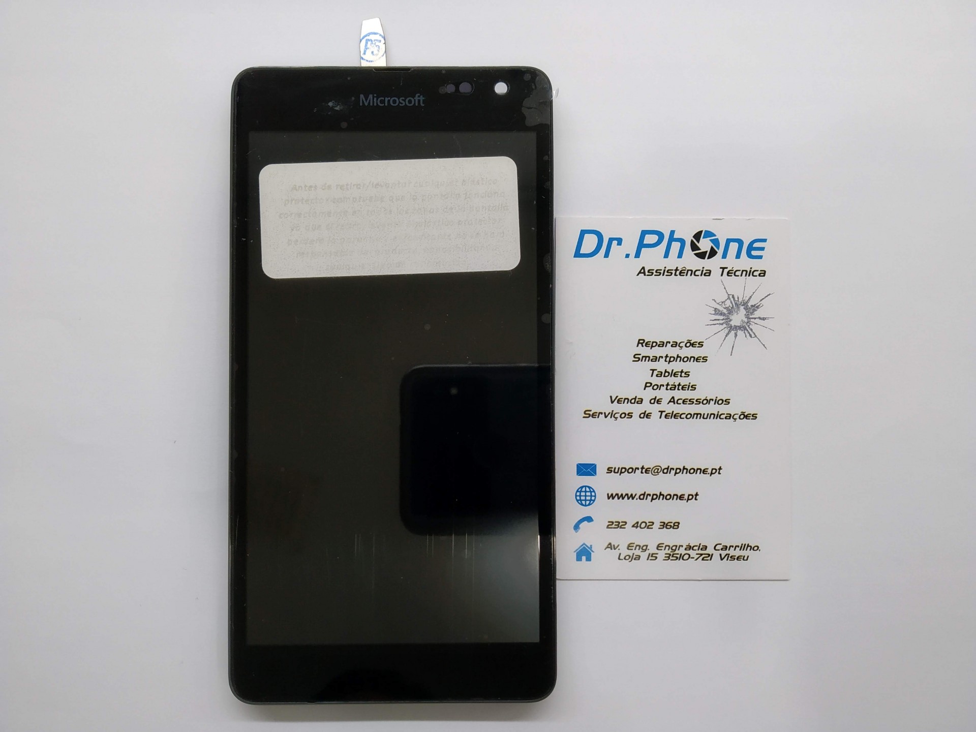 Smartphone Microsoft preto com etiqueta e cartão de visita Dr.Phone