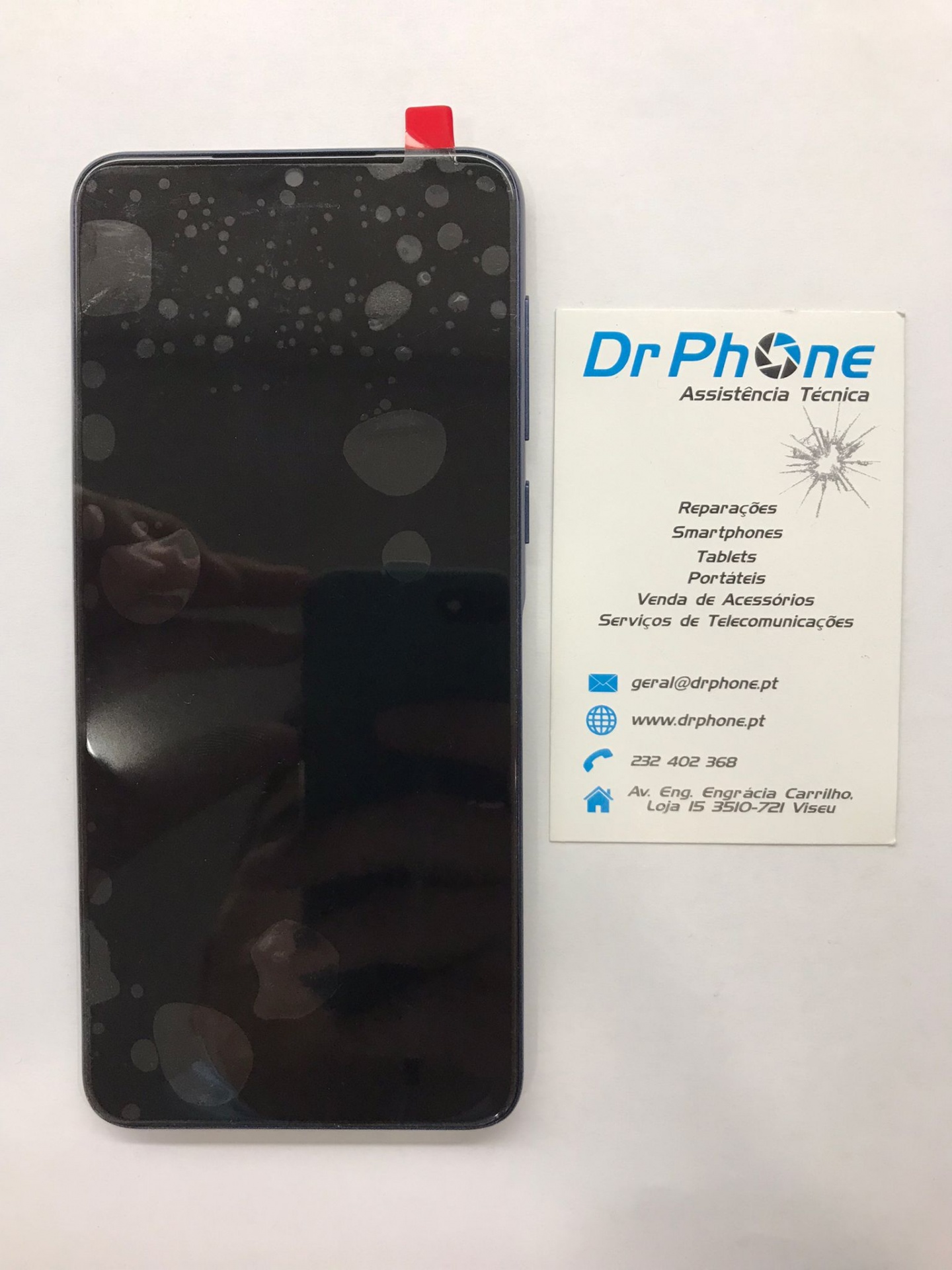 Smartphone preto com película protetora e cartão de visita Dr Phone