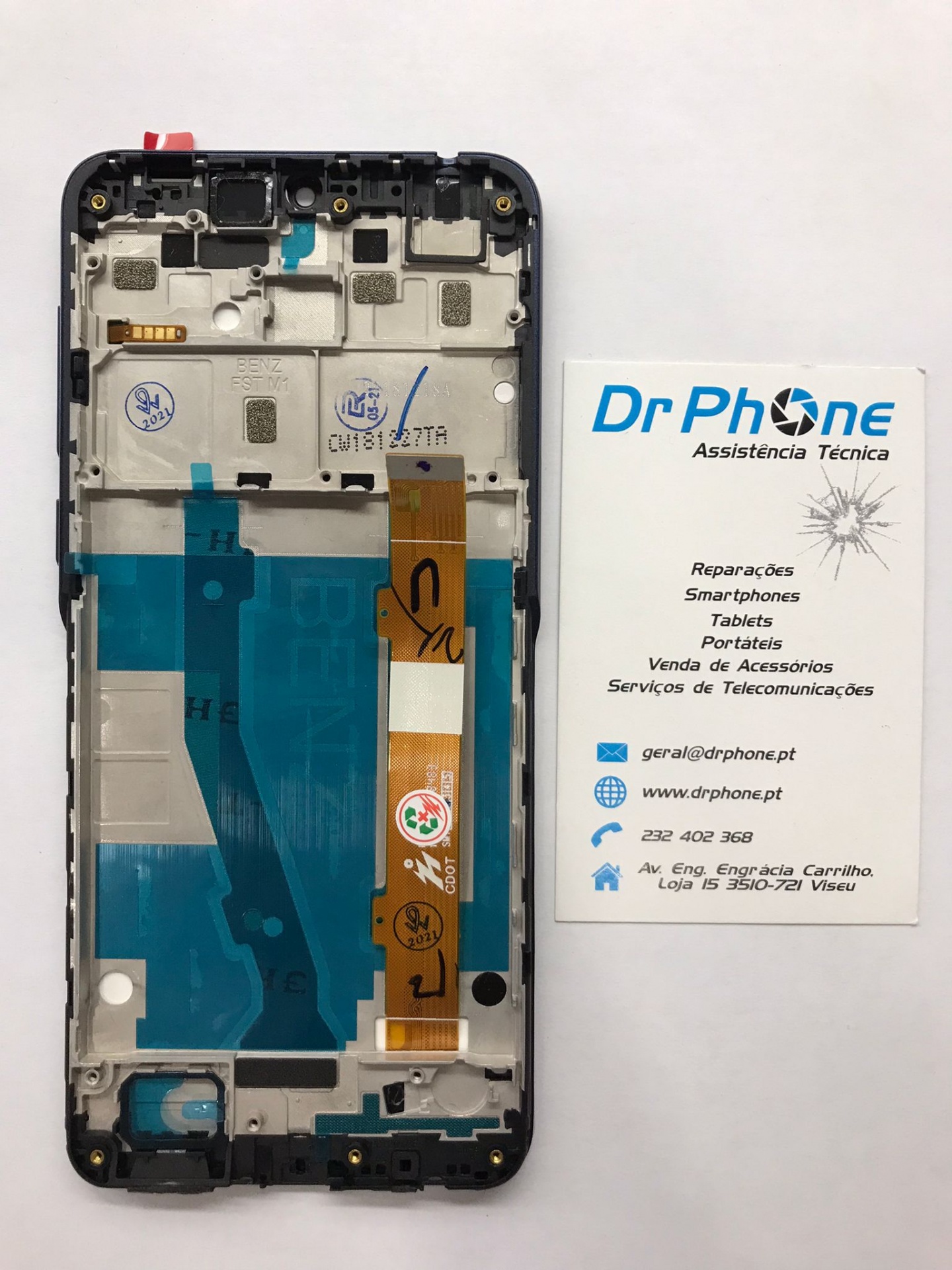 Parte interna de telemóvel desmontado com cartão de visita Dr Phone