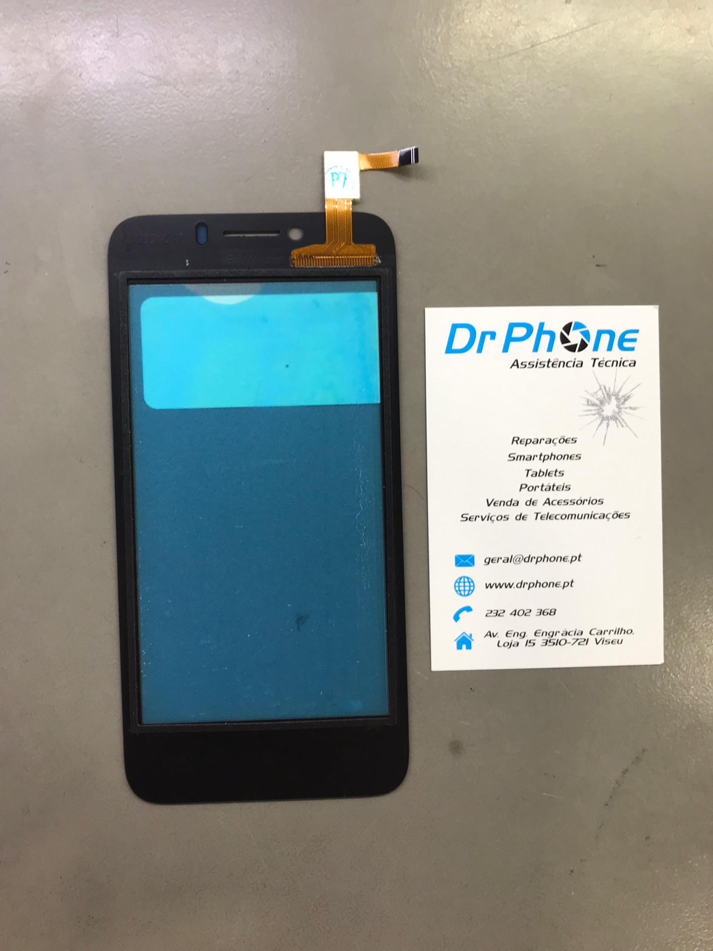 Ecrã tátil preto para smartphone com cartão de visita Dr Phone ao lado