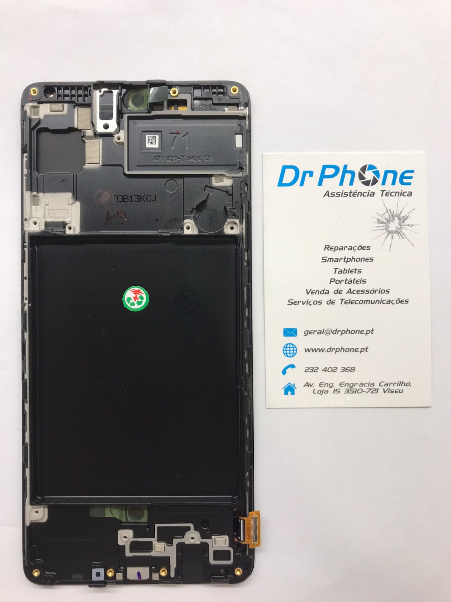 Smartphone desmontado com bateria e peça interna visível ao lado de cartão de visita da Dr Phone Assistência Técnica
