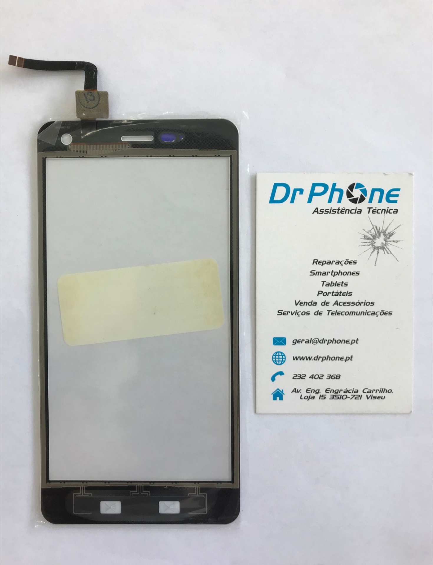 Ecrã tátil preto para smartphone ao lado de cartão de visita Dr Phone assistência técnica