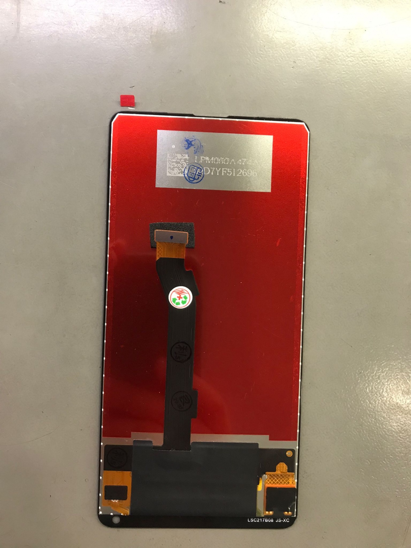 Ecrã traseiro vermelho metálico para telemóvel com conector flexível preto e etiqueta prateada.