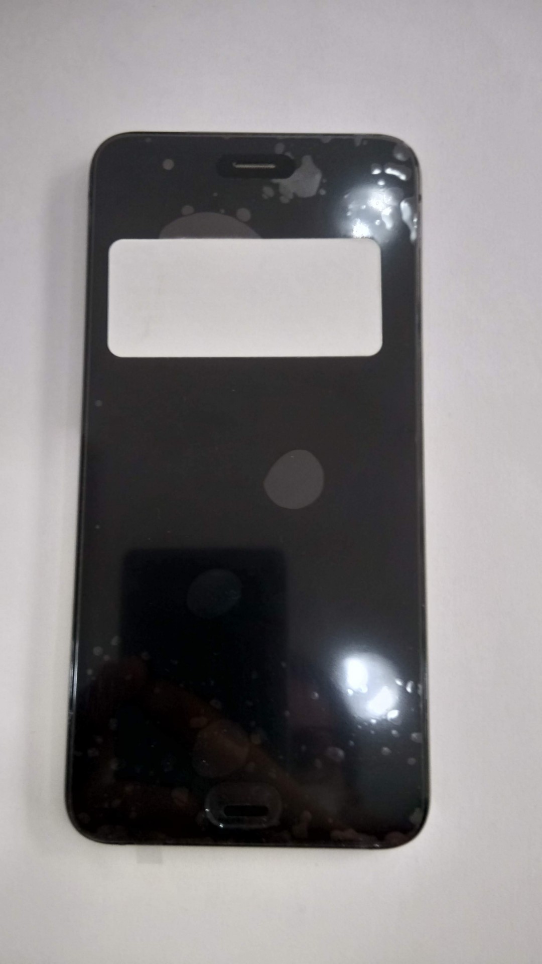 Smartphone preto com etiqueta branca no ecrã sobre superfície branca