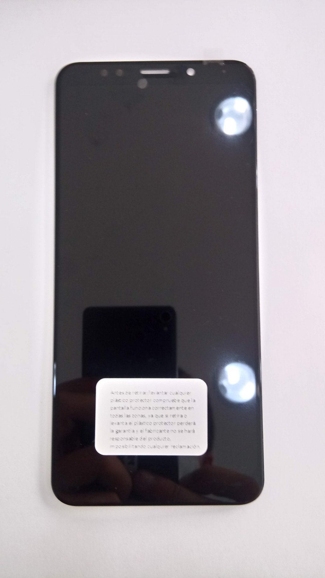Smartphone preto com etiqueta branca no ecrã