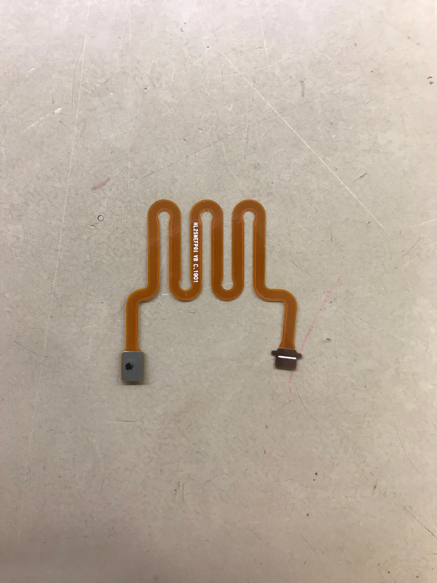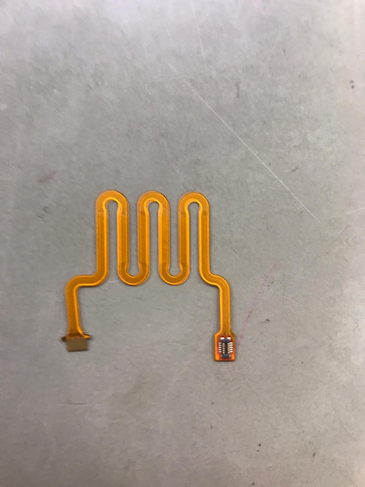 Cabo flexível amarelo com padrão ondulado e componentes eletrónicos nas extremidades