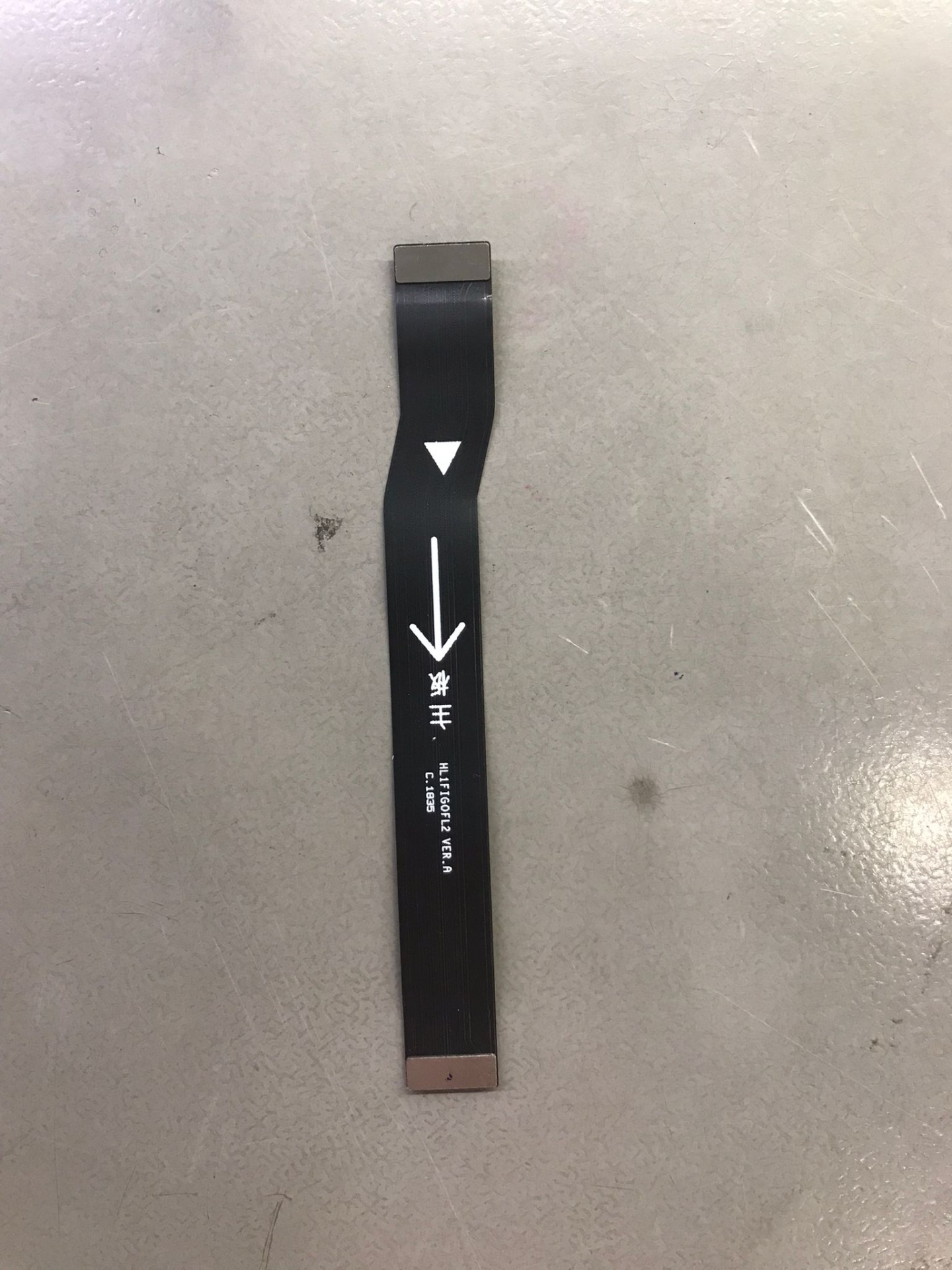 Cabo flexível preto com seta branca e texto, sobre superfície cinzenta lisa