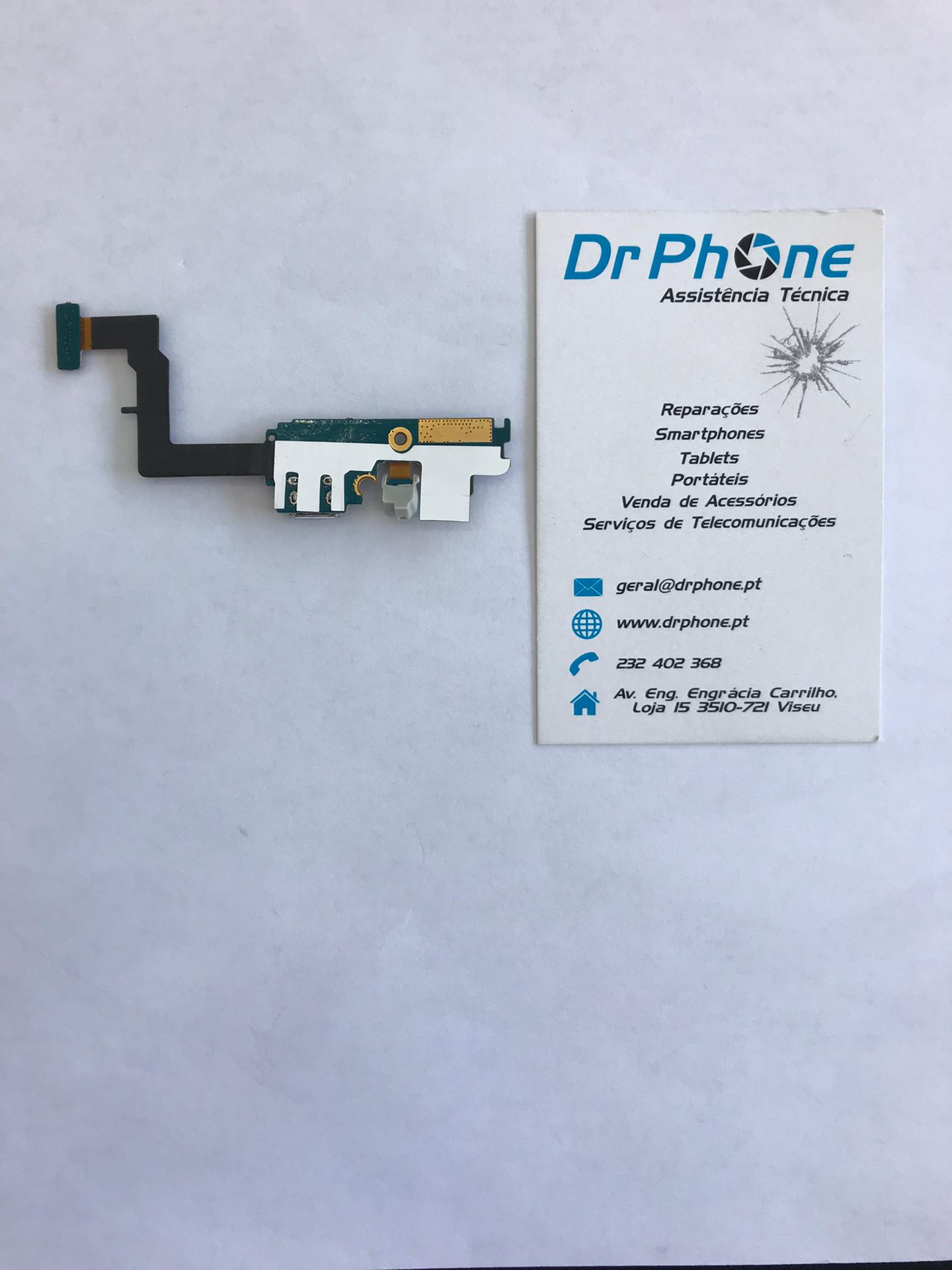 Peça eletrónica pequena e cartão de visita da Dr Phone com texto em português.