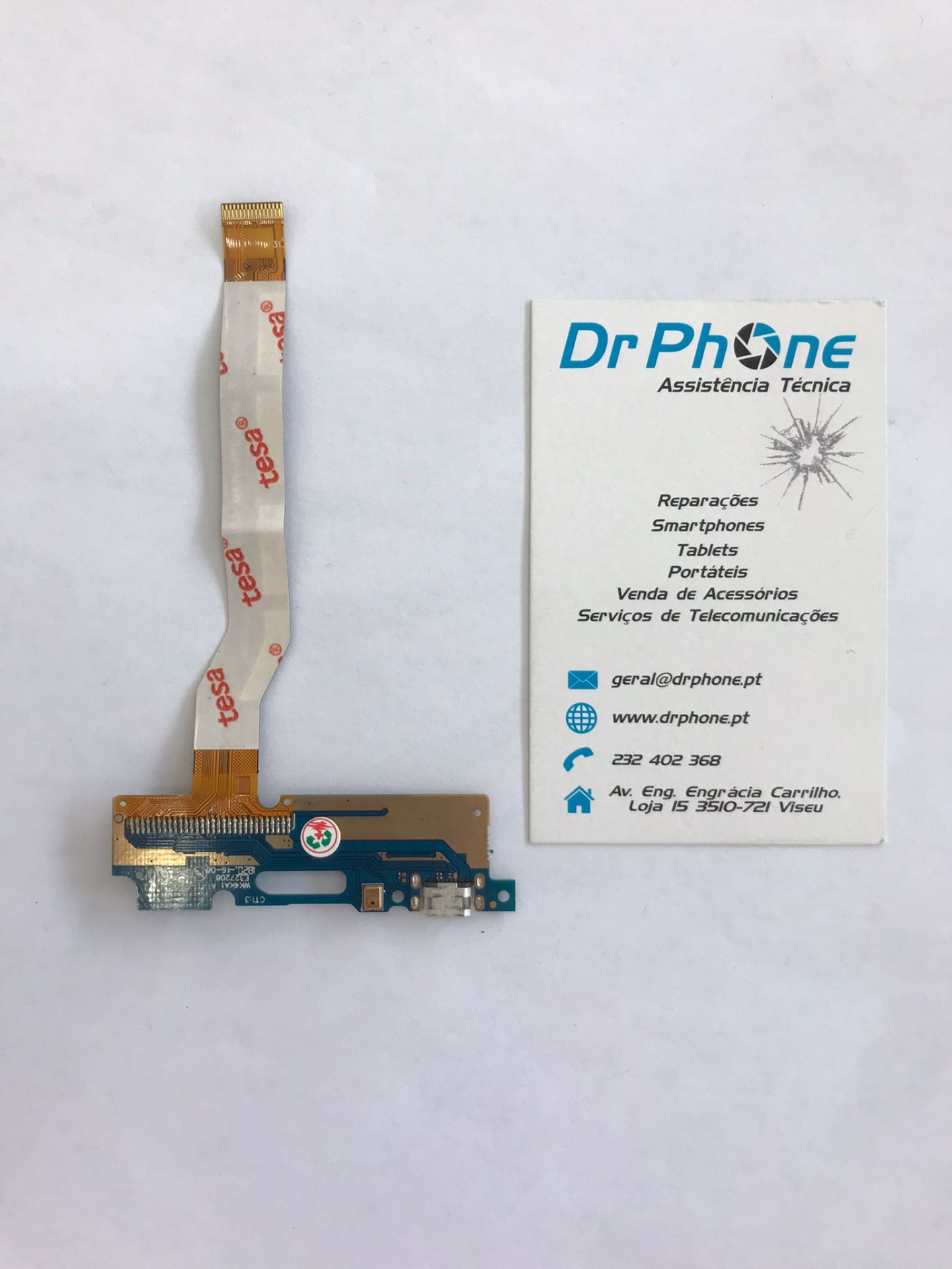 Placa eletrónica com fita adesiva e cartão de visita da Dr Phone