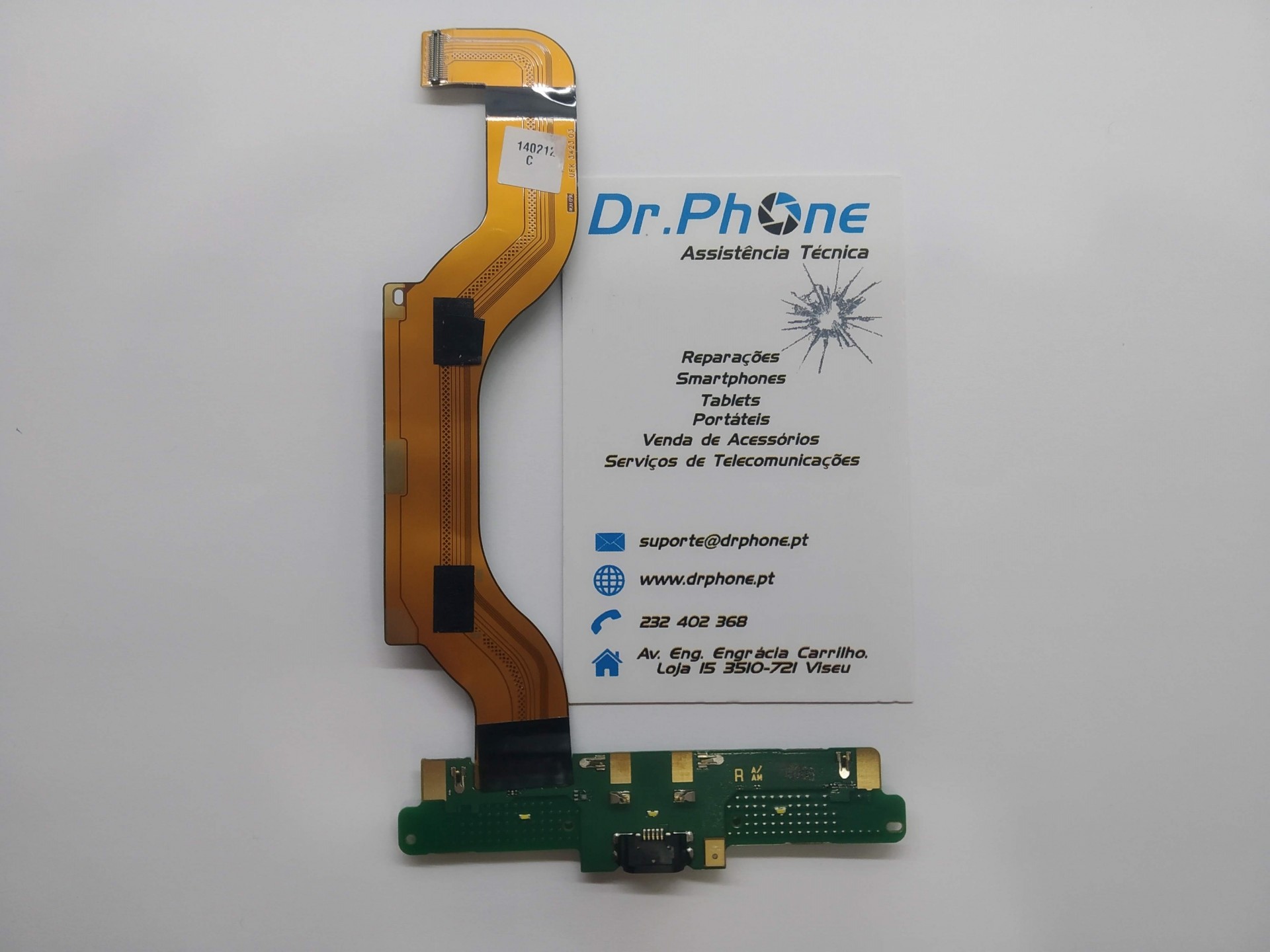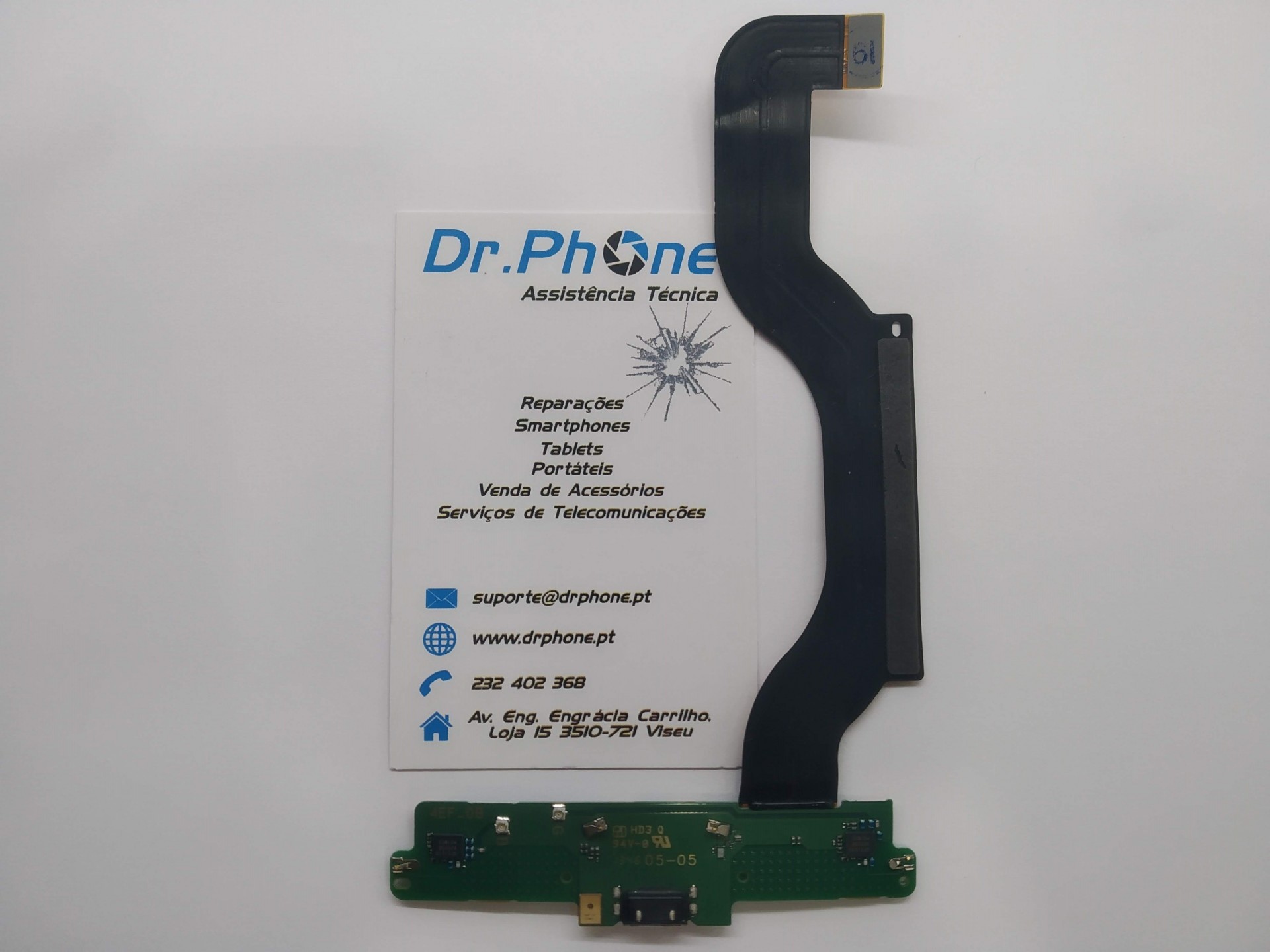 Placa eletrónica flexível com componente verde e papel promocional da Dr.PHONE Assistência Técnica