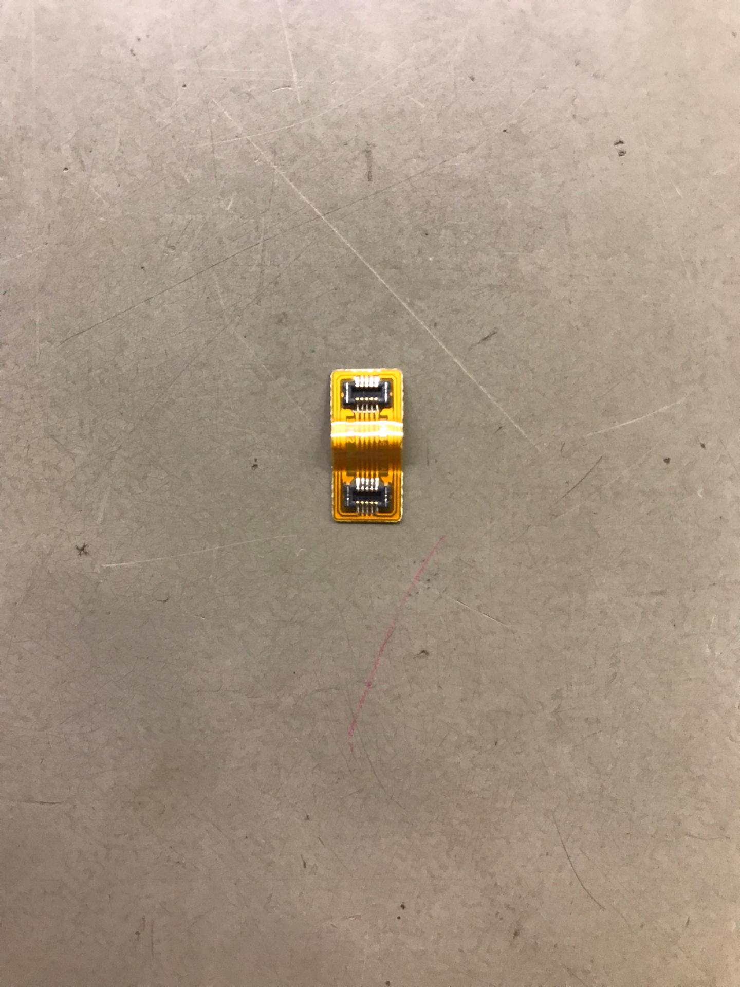 Componente eletrónico flexível amarelo com duas partes metálicas prateadas sobre superfície cinzenta