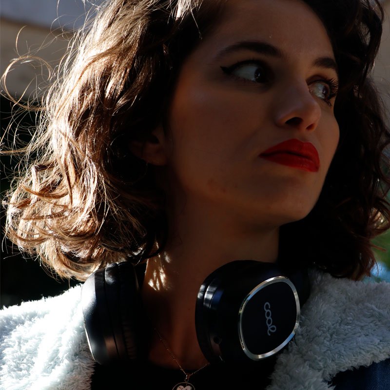 Mulher com auscultadores pretos Oppo e casaco branco peludo em luz natural