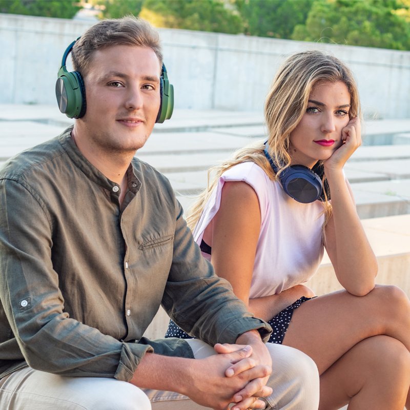 Homem e mulher sentados com auscultadores grandes, camisa verde e top branco em espaço exterior