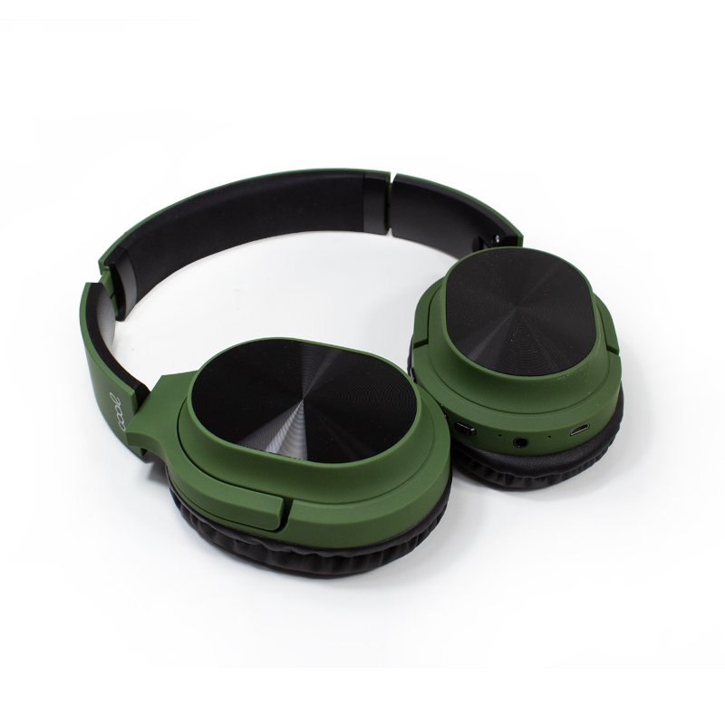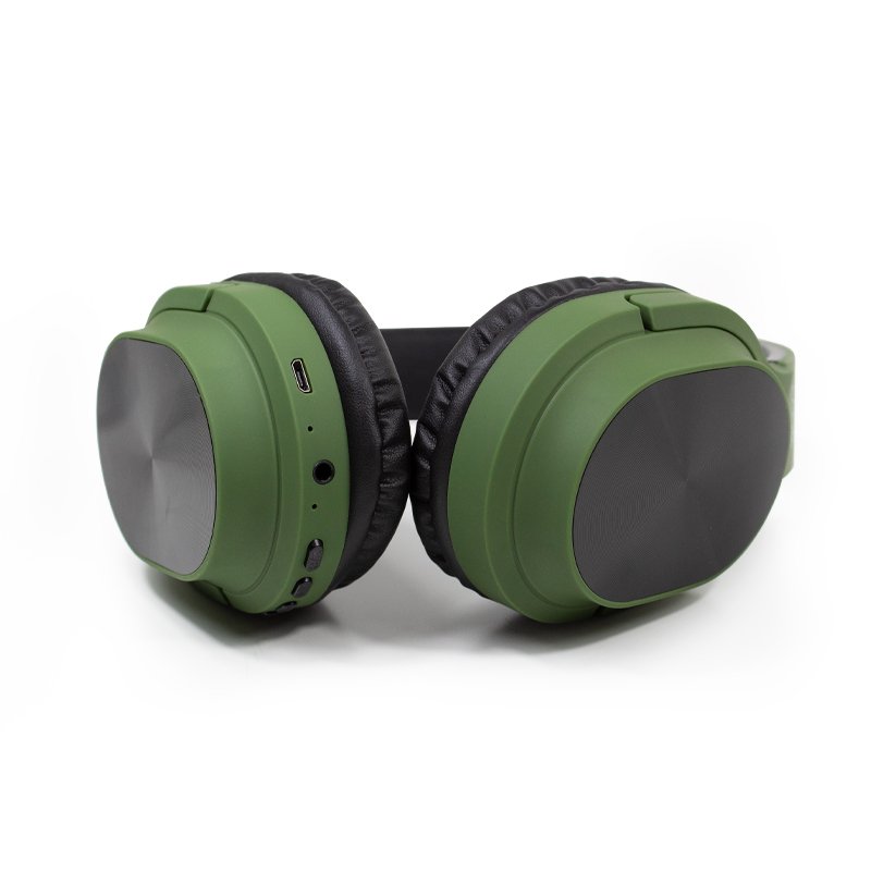 Auriculares over-ear verde militar e preto sobre fundo branco