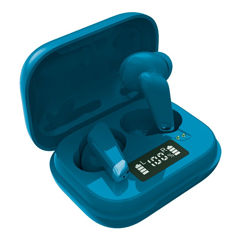 Auriculares sem fios azuis com estojo de carregamento e ecrã digital