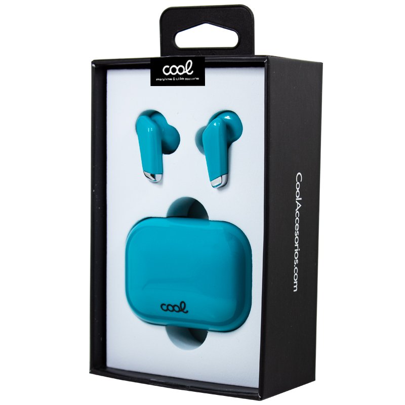 Auscultadores sem fios e estojo azul turquesa na caixa preta com logótipo COOL