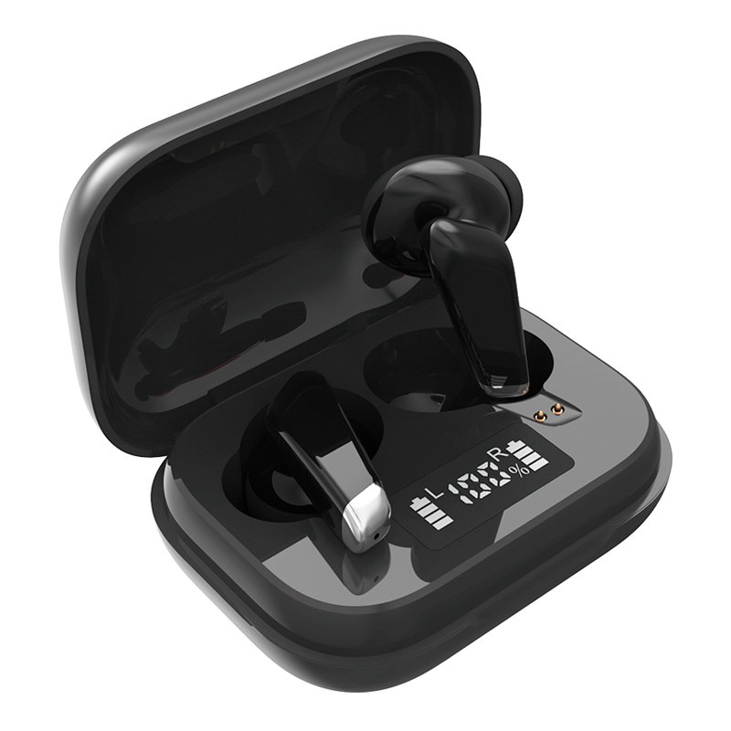 Auriculares sem fios pretos com estojo de carregamento preto e ecrã digital
