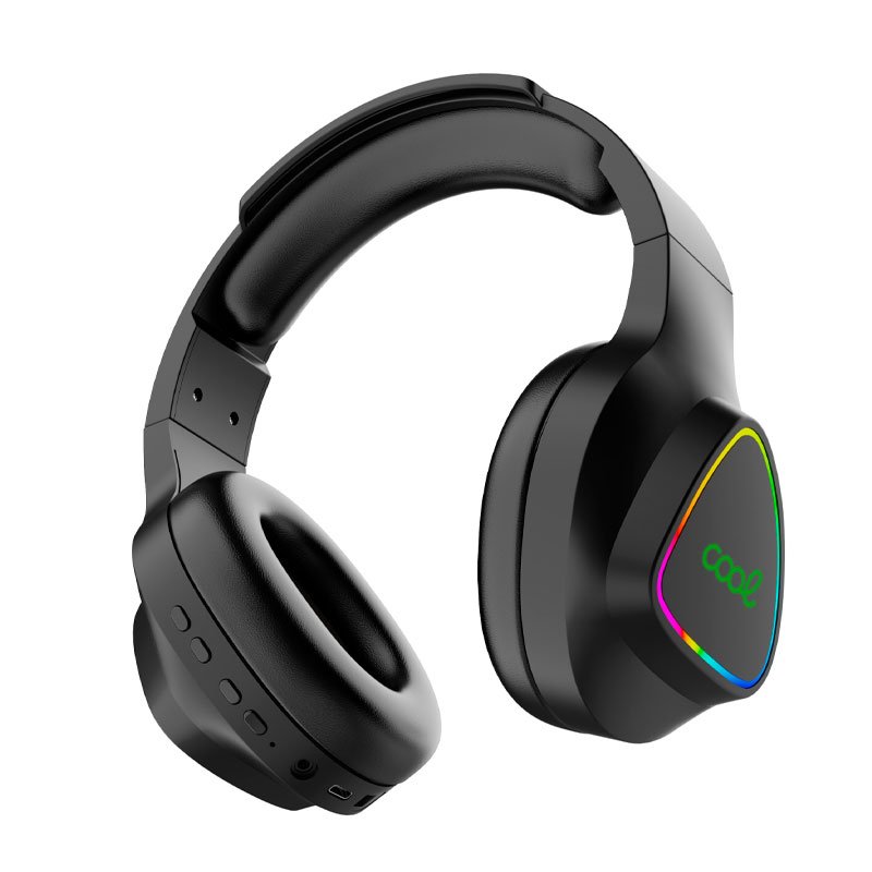 Auriculares over-ear pretos com luz RGB e palavra 'cool'