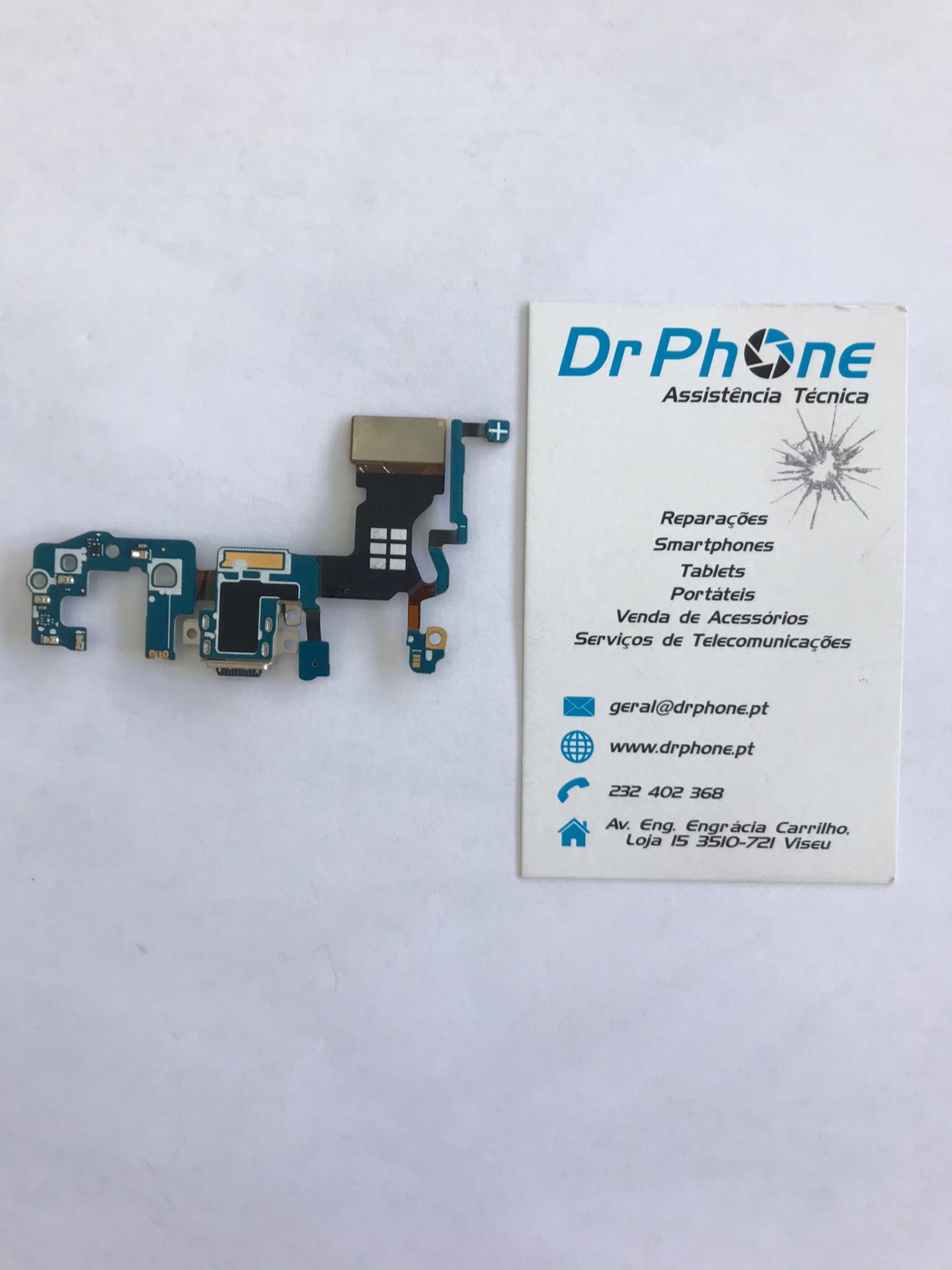 Peça eletrónica para smartphone ao lado de cartão de visita da assistência técnica Dr Phone