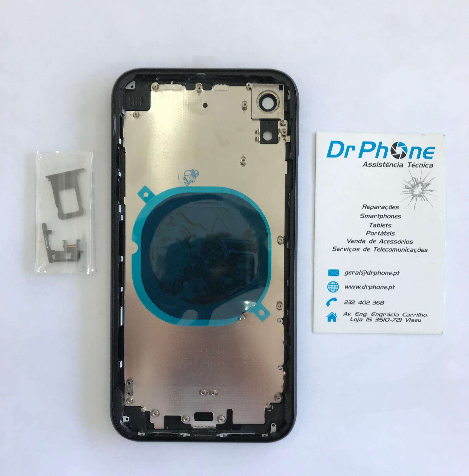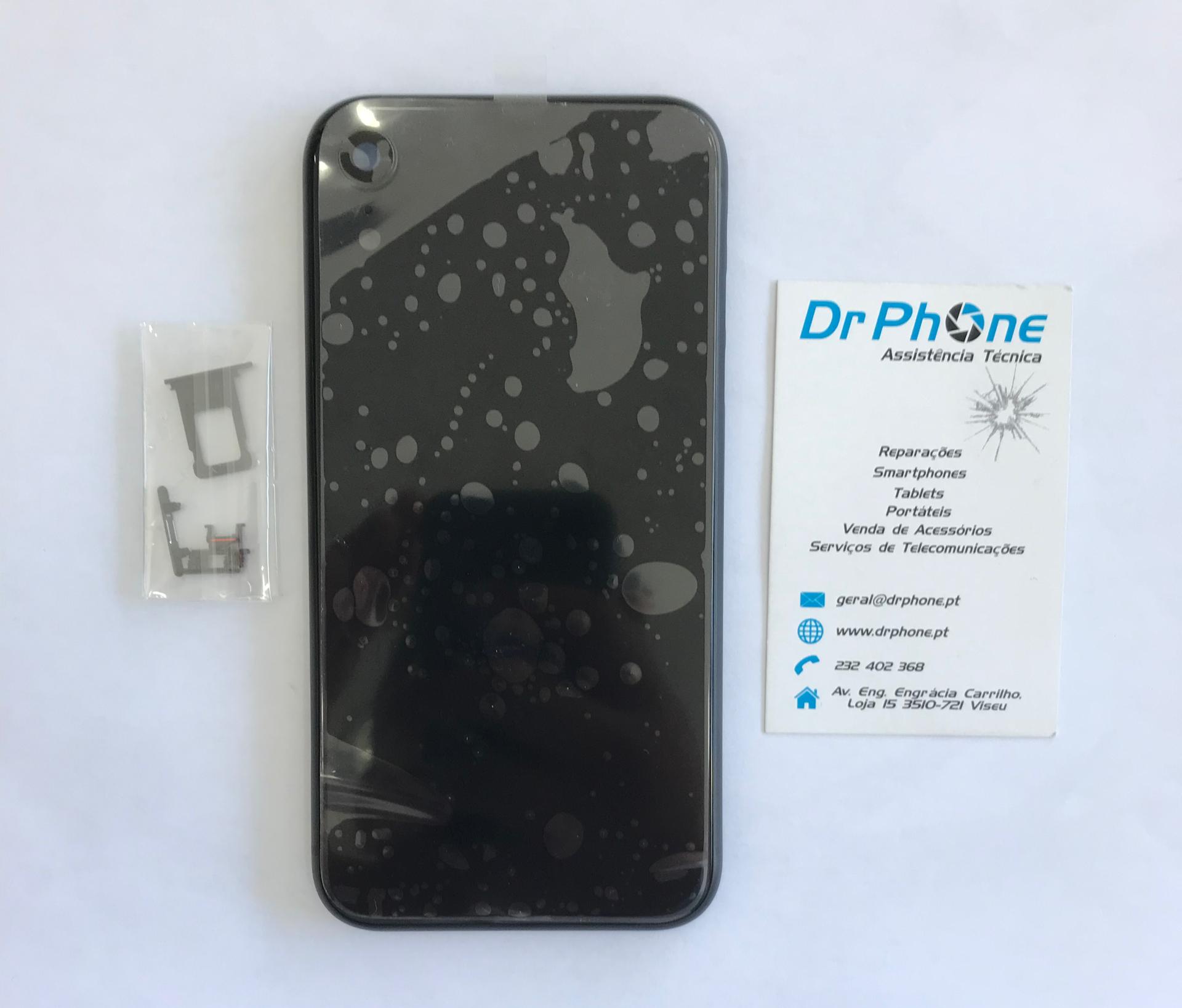 Smartphone preto com bolhas no ecrã, acessórios metálicos e cartão Dr Phone