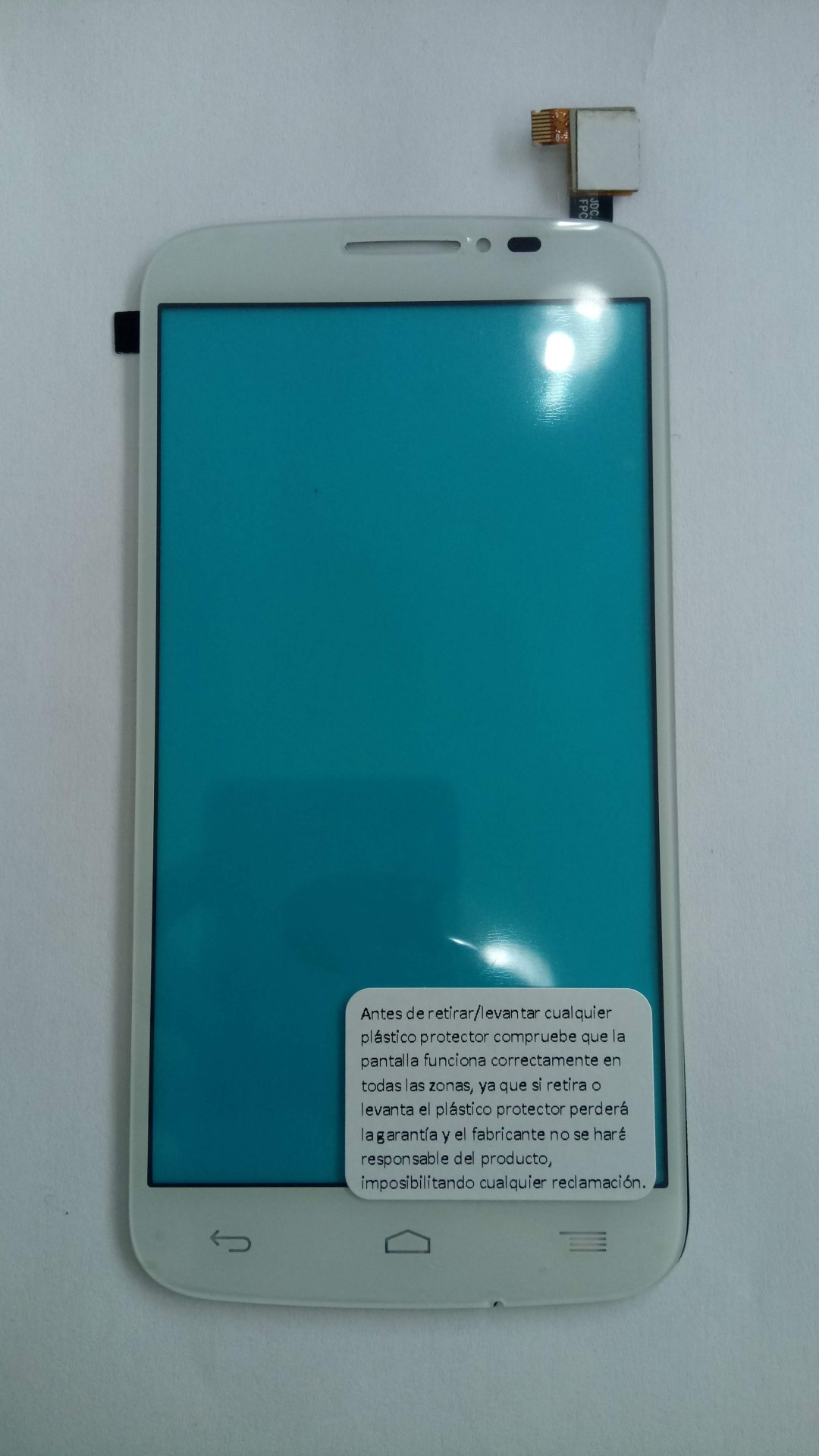 Ecrã para smartphone branco com etiqueta azul e texto em castelhano