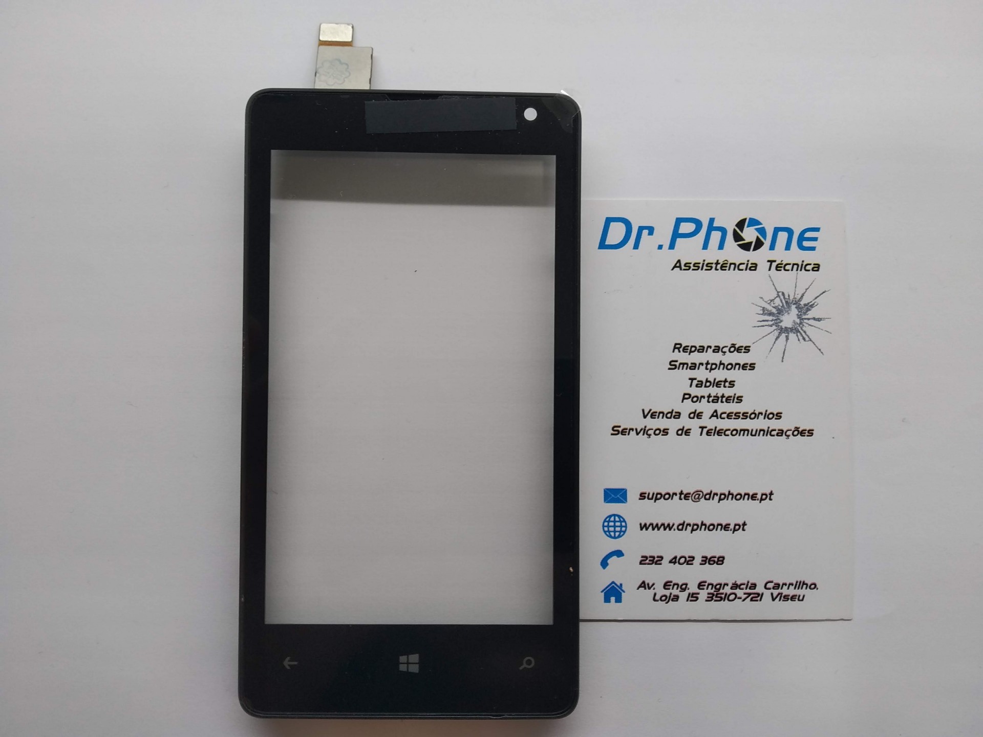 Ecrã tátil negro para smartphone ao lado de cartão de visita Dr.Phone
