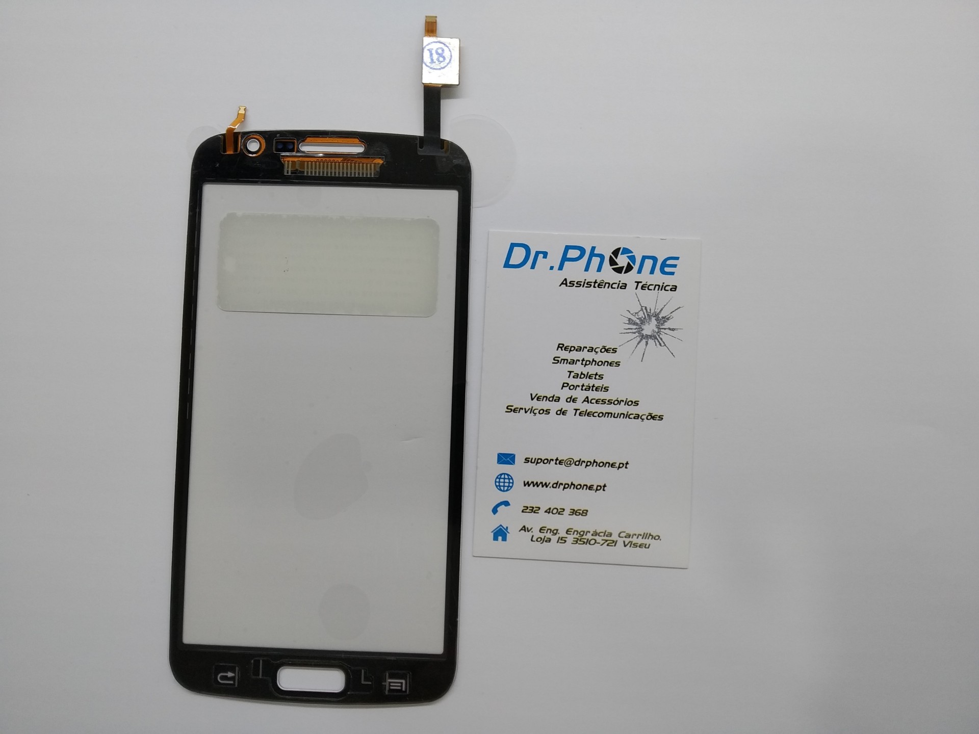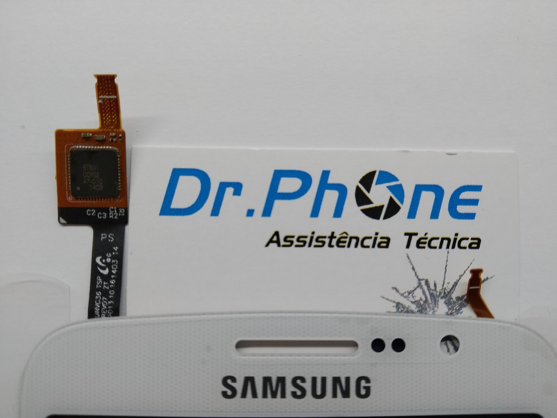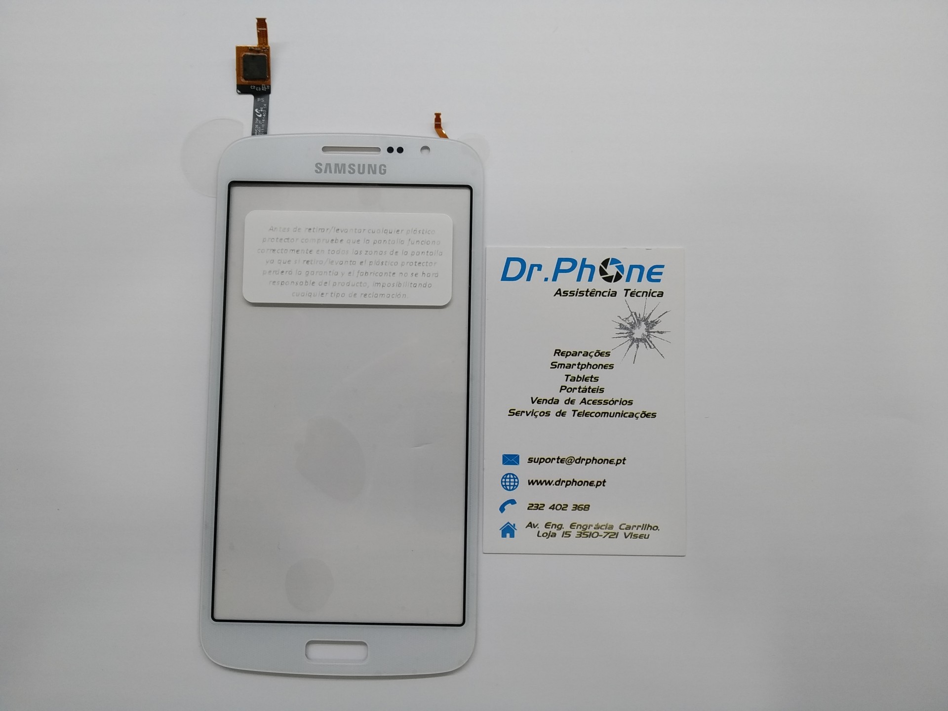 Ecrã tátil branco Samsung ao lado de cartão de assistência técnica Dr. Phone