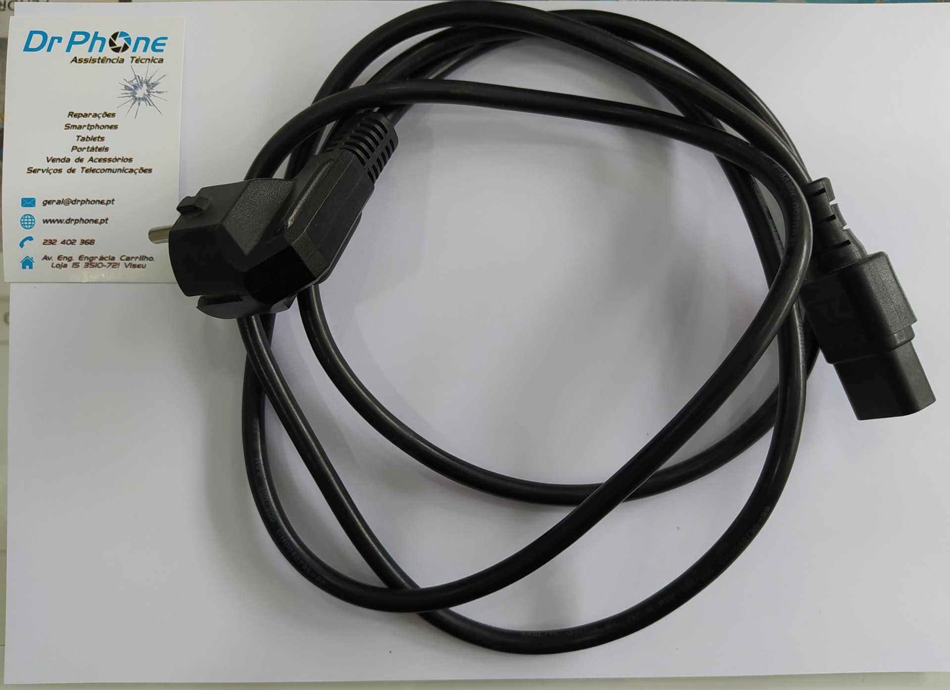 Cabo de alimentação preto com conector tripolar e cartão de visita da DR PHONE