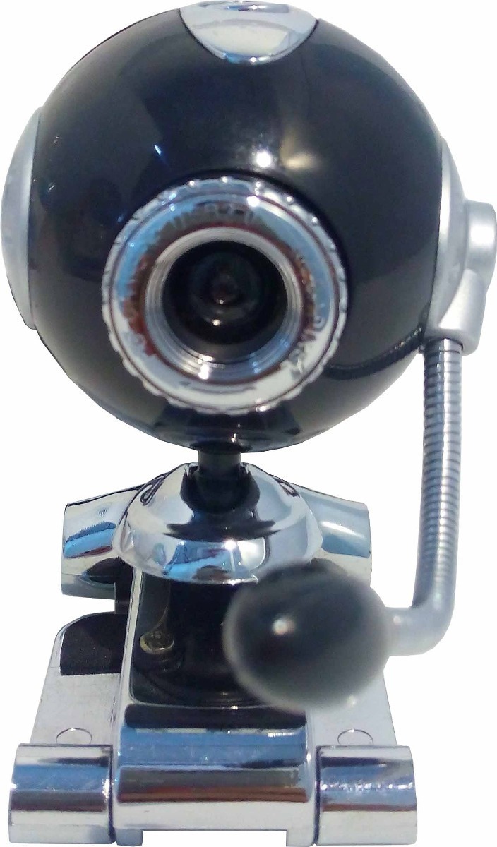 Câmara web preta e prata com suporte metálico sobre fundo branco